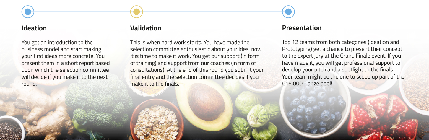 Challenge lasts six months (from January until June 2020). It consists of three rounds: Ideation, Validation and Presentation. Each phase ends with a selection round, not all teams will make it to the finals.